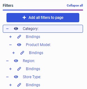 - If the content that you added to the page includes dynamic parameter filters, an indicator appears on the Filters tab on the sidebar. Select the Filters tab and then click Add all filters to page to create controls for all parameters in your content, or right-click a specific parameter in the list and click Add to page to create a control for it.