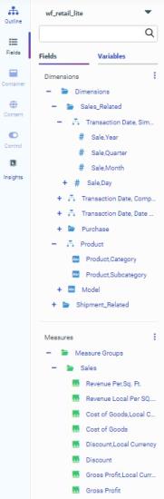 The canvas shows a design view of your content. To see a full run-time view of your visualization, with run-time functionality such as drilldowns, In-Document Analytics, and more, click Run in new window on the Visualization toolbar. Your content runs in a new browser tab or window.