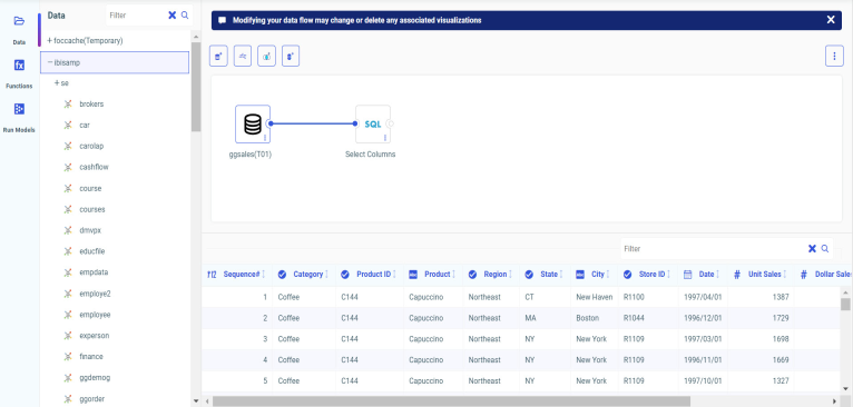 - Data sheet. The current state of your data is reflected in the Data sheet, which shows a data sample in a tabular format similar to a spreadsheet. The Data sheet appears when you select a synonym on the canvas.
