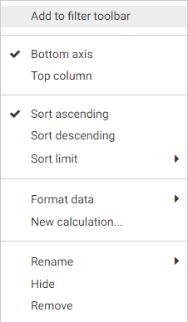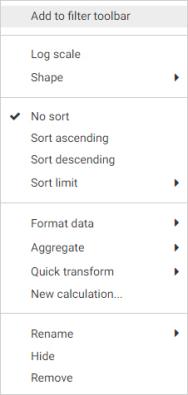 - Right-click a field from the Resources panel or a bucket in the Properties panel and click Add to filter toolbar.