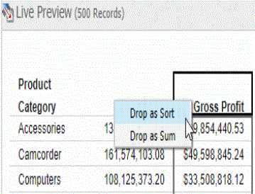 When working with a report in Live Preview, you can rearrange the columns of the report by dragging them to the left or right, depending on your display preference. If the column is numeric, you are presented with the option to Drop as Sum or Drop as Sort, as shown in the following image.