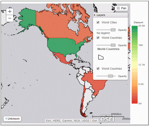 In Chart mode, you can also use the Auto Drill and Auto Linking features that are available when you create charts or reports in WebFOCUS InfoAssist. In Visualization mode, you can also drill up and down within different levels in a data hierarchy in a map. Auto Drill allows you to navigate through the geographical hierarchy of your map data at run time. You can use this information to visualize the same measure at different geographical hierarchies, such as Countries to States and States to Cities. Auto Linking allows you to connect to related charts or reports in your environment that share similar data parameters.