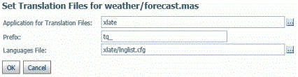 Alternately, you can right-click the forecast synonym, point to Metadata Management, and select Prepare Translation Files. The Set Translation File for weather/forecast.mas page opens, as shown in the following image. Enter the values shown in the following image and click OK.