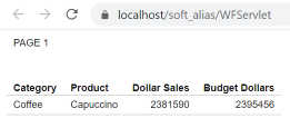 If you run the drill-down request with DRILLMETHOD=GET, and select a category, for example, Coffee, the parameters and values are included in the URL, as shown in the following image.