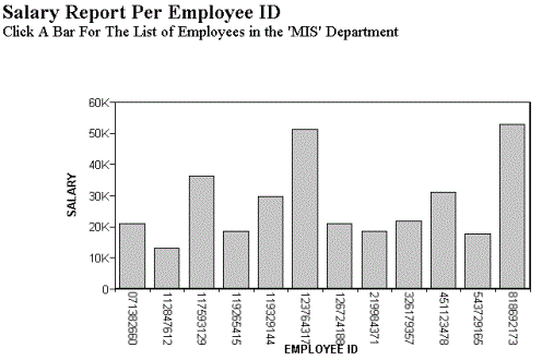 SET3D=OFF GRAPH FILE EMPLOYEE HEADING "Salary Report Per Employee ID" "Click A Bar For The List of Employees in the '&DEPARTMENT' Department" SUM SALARY ACROSS EMP_ID AS 'EMPLOYEE ID' ON GRAPH SET STYLE * TYPE=DATA, ACROSSCOLUMN=SALARY, FOCEXEC=EMPBYDEP(DEPARTMENT='&DEPARTMENT'), $ ENDSTYLE END