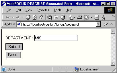 TABLE FILE EMPLOYEE HEADING "List Of Employees in the '&DEPARTMENT' Department " PRINT FIRST_NAME LAST_NAME BY DEPARTMENT WHERE DEPARTMENT EQ '&DEPARTMENT'; ON TABLE SET PAGE-NUM OFF ON TABLE SET STYLE * TYPE=REPORT, GRID=OFF, $ ENDSTYLE END