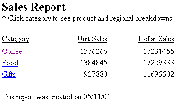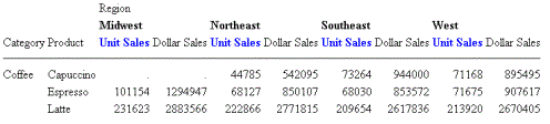 When you run the report, the values for the field CATEGORY (Coffee, Food, Gifts) are linked to a report that contains the product and regional breakdowns for the respective value.