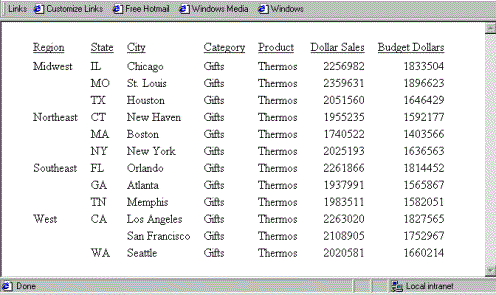 SET HTMLCSS = ON TABLE FILE GGSALES SUM CATEGORY PRODUCT DOLLARS BUDDOLLARS BY REGION BY ST BY CITY WHERE DOLLARS GT BUDDOLLARS ON TABLE SET PAGE-NUM OFF ON TABLE SET STYLE * TYPE=REPORT, GRID=OFF, $ LEFTMARGIN = 1, $ ENDSTYLE END