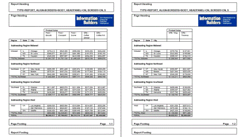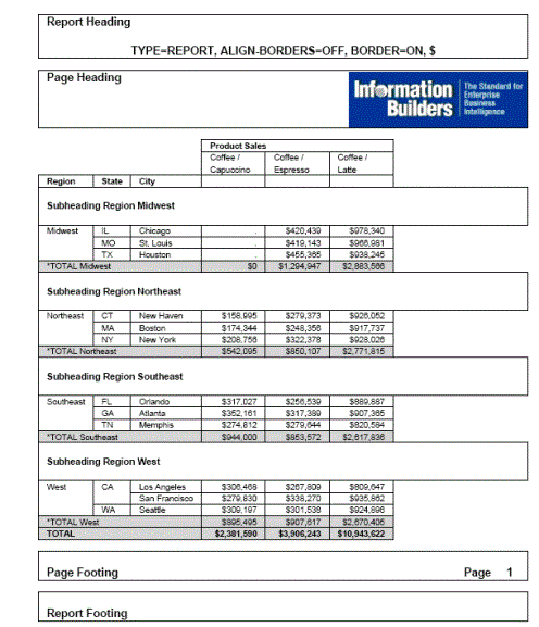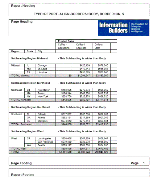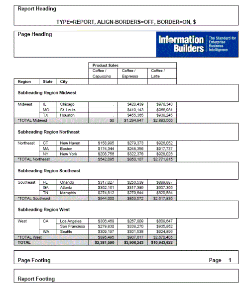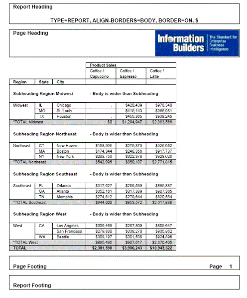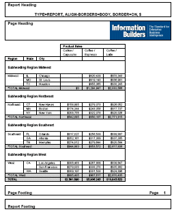The following request against the GGSALES data source has a report heading, report footing, page heading, page footing, and a subheading for each region. The margins of the subheadings and subfootings are not aligned (ALIGN-BORDERS=OFF ,$):