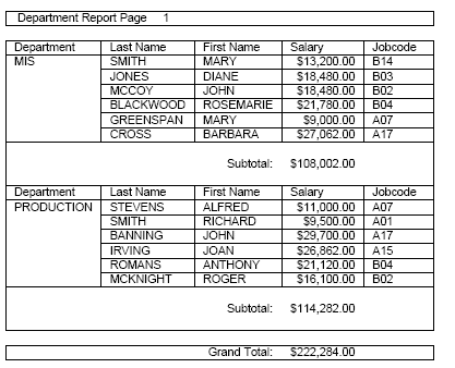 When the body lines are wider than the subheading and subfooting lines, the border and backcolor of the subheading and subfooting lines are expanded to match the width of the data lines, as shown on the following report output.