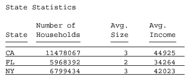 SET ONLINE-FMT = PDF TABLE FILE GGDEMOG HEADING "State Statistics" " " SUM HH AS 'Number of,Households' AVGHHSZ98 AS 'Avg.,Size' MEDHHI98 AS 'Avg.,Income' BY ST WHERE ST EQ 'CA' OR 'FL' OR 'NY' ON TABLE SET PAGE-NUM OFF ON TABLE SET STYLE * TYPE=DATA, HGRID=ON, $ ENDSTYLE END