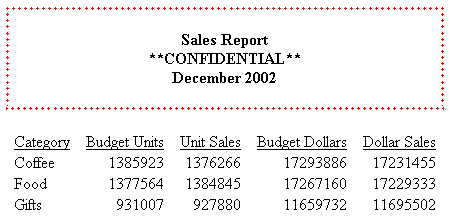 Borders: In a PDF, HTML, DHTML, XLSX, EXL2K, PPTX, PPT, or PS report, you can use BORDER attributes in a StyleSheet to specify the weight, style, and color of border lines. If you wish, you can specify formatting variations for the top, bottom, left, and right borders.