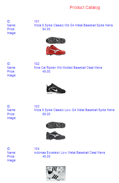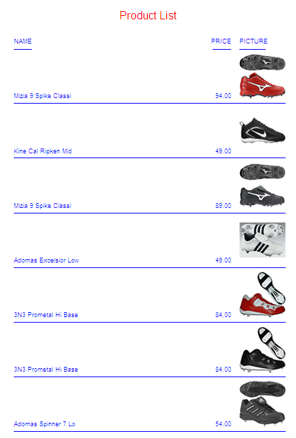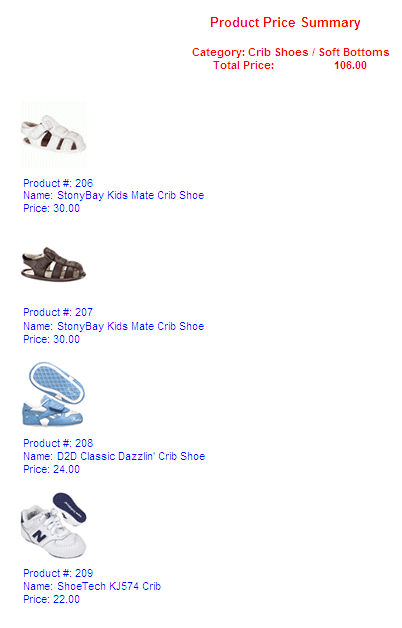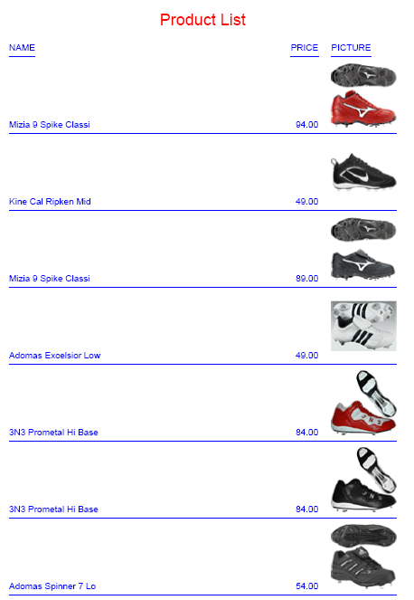 The following request joins the two data sources and prints product images in a subheading. The output is generated in DHTML format. It can also be generated in HTML or PDF format.