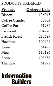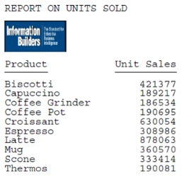 SET HTMLCSS = ON TABLE FILE GGSALES SUM UNITS BY PRODUCT ON TABLE SUBHEAD "REPORT ON UNITS SOLD" " " " " " " " " " " ON TABLE SET PAGE-NUM OFF ON TABLE PCHOLD FORMAT PDF ON TABLE SET STYLE * TYPE=REPORT, GRID=OFF, $ TYPE=TABHEADING, IMAGE=Ibi_logo.png, POSITION=(0 .30), SIZE=(1 0.5), $ ENDSTYLE END