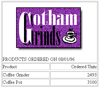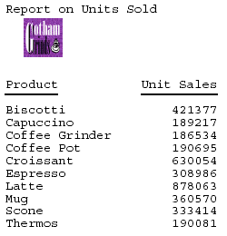 The image file for this example is GOTHAM.GIF. The POSITION attribute places the image one-quarter inch horizontally and one-quarter vertically from the upper-left corner of the report page. The image is one-half inch wide and one-half inch high as specified by SIZE.