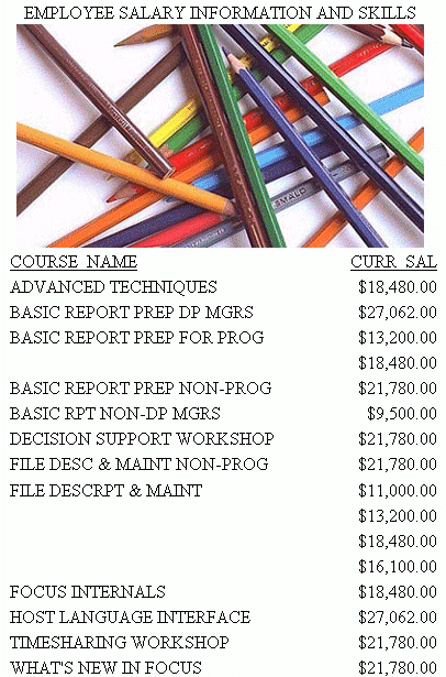 -* Rel 7705 DHTML and HTML supports including images stored in -* BLOB field in report column, heading, footing, subhead, or -* subfoot -* Rel 769 supports PDF format SET PRINTPLUS=ON JOIN PRODUCTID IN RETAILDETAIL TO PRODUCTID IN RETAILIMAGE TABLE FILE RETAILDETAIL HEADING CENTER "Product Price Summary" " " SUM PRICE NOPRINT BY CATEGORY NOPRINT ON CATEGORY SUBHEAD " Category: <CATEGORY " " Total Price: <PRICE " " "