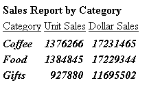 TABLE FILE GGSALES HEADING "Sales Report by Category" SUM UNITS DOLLARS BY CATEGORY ON TABLE SET STYLE * TYPE=REPORT, STYLE=BOLD+ITALIC, $ TYPE=HEADING, STYLE=-ITALIC, $ TYPE=TITLE, STYLE=-BOLD-ITALIC, $ TYPE=REPORT, GRID=OFF, $ ENDSTYLE END
