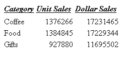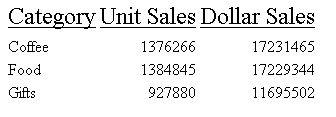 TABLE FILE GGSALES ON TABLE SET PAGE-NUM OFF SUM UNITS DOLLARS BY CATEGORY ON TABLE SET STYLE * TYPE=TITLE, SIZE=12, $ TYPE=REPORT, GRID=OFF, $ ENDSTYLE END