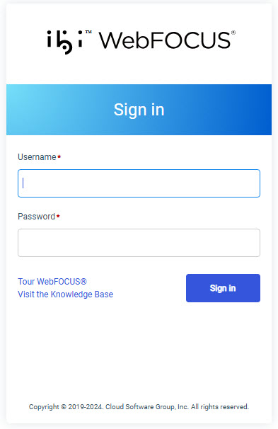 You can open WebFOCUS from any web browser, using the address created during the installation. The sign-in page and default start page may be different depending on the configuration requirements of your organization.