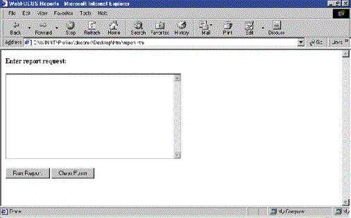 <HTML> <HEAD> <TITLE> WebFOCUS Report </TITLE> </HEAD> <BODY> <H4>Enter report request:</H4><FORM METHOD="get" ACTION="/ibi_apps/WFServlet"> <P ALIGN=LEFT NOWRAP><PRE> <TEXTAREA NAME="IBIF_adhocfex" VALUE="" ROWS=12 COLS=48 ALIGN=LEFT> </TEXTAREA> </PRE></P> <P> <INPUT NAME="submit" TYPE=SUBMIT VALUE="Run Report"> <INPUT NAME="reset" TYPE=RESET VALUE="Clear Form"> </P> </FORM>