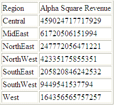 SELECT T11."REGION", SUM(T1."Revenue"), ((CHAR(BIGINT( SUM(T1."Revenue") * SUM(T1."Revenue")) ) )) FROM wrd_fact_sales T1, wrd_dim_customer T5, wrd_dim_geography T11 WHERE (T5."ID_CUSTOMER" = T1."ID_CUSTOMER") AND (T11."ID_GEOGRAPHY" = T5."ID_GEOGRAPHY") GROUP BY T11."REGION " ORDER BY T11."REGION " FOR FETCH ONLY; END
