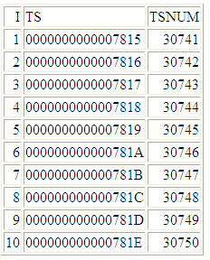 DEFINE FILE TSTEST TSNUM/P21=TSTOPACK(TS,'P21'); END TABLE FILE TEST64 PRINT I TS TSNUM END