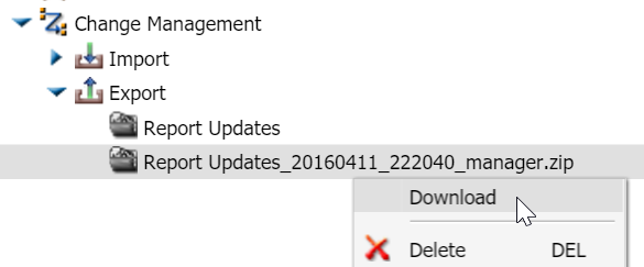 The export process saves a CM zip file to drive:\ibi\WebFOCUS82\cm\export. The download process takes that CM zip file, and downloads it to your local machine. You can then transfer the copy of that CM zip file to another WebFOCUS environment for use as a change management package.