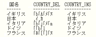 The output displays the original COUNTRY field, the COUNTRY_DEL field with the shift code deleted, and the COUNTRY_INS field with the shift code re-inserted.