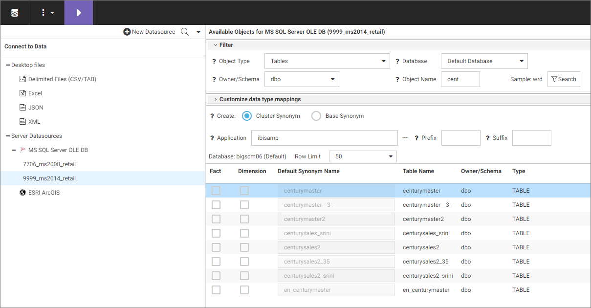 You can configure adapters and connect to data sources that you can use to build reports, charts, and visualizations using WebFOCUS. You can also create a synonym for one or more data objects, or create cluster synonyms for select objects assigned as facts or dimensions.