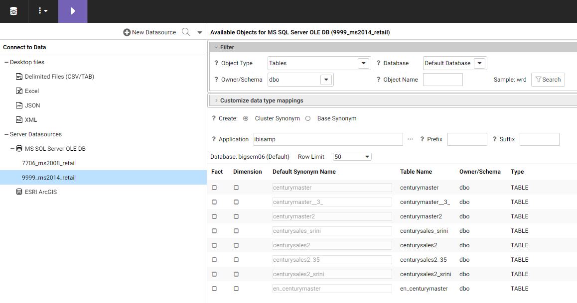 You can configure adapters and connect to data sources that you can use to build reports, charts, and visualizations using WebFOCUS. You can also create a synonym for one or more data objects, or create cluster synonyms for select objects assigned as facts or dimensions.