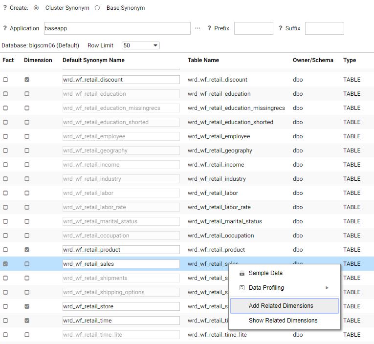 Note: Show and Add Related Dimensions options are only available for Relational data sources if Foreign Key to Primary key information is available in the RDBMS.