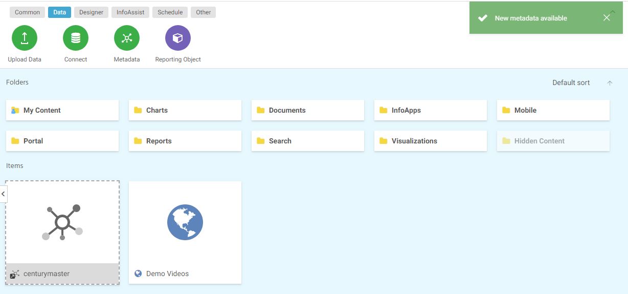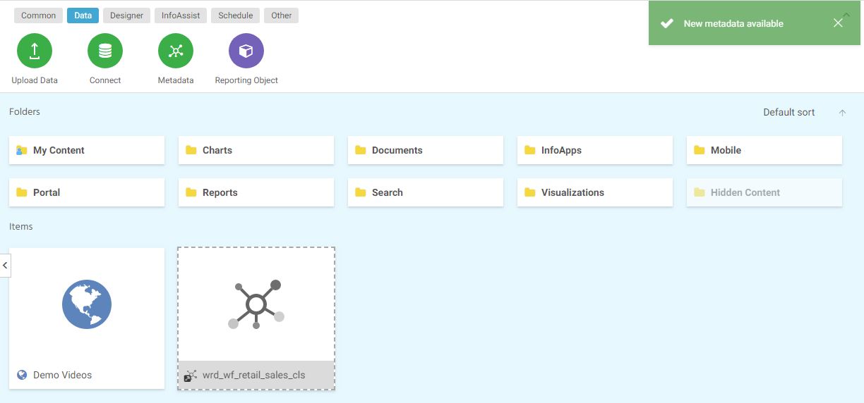 You are returned to the Home Page. A message displays indicating your new data is available. A shortcut to your new data is added to the repository folder from where you connected to data, as shown in the following image.