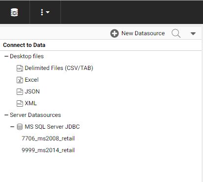 Note: Once configured, the adapter appears beneath Server Datasources in the Connect to Data panel.