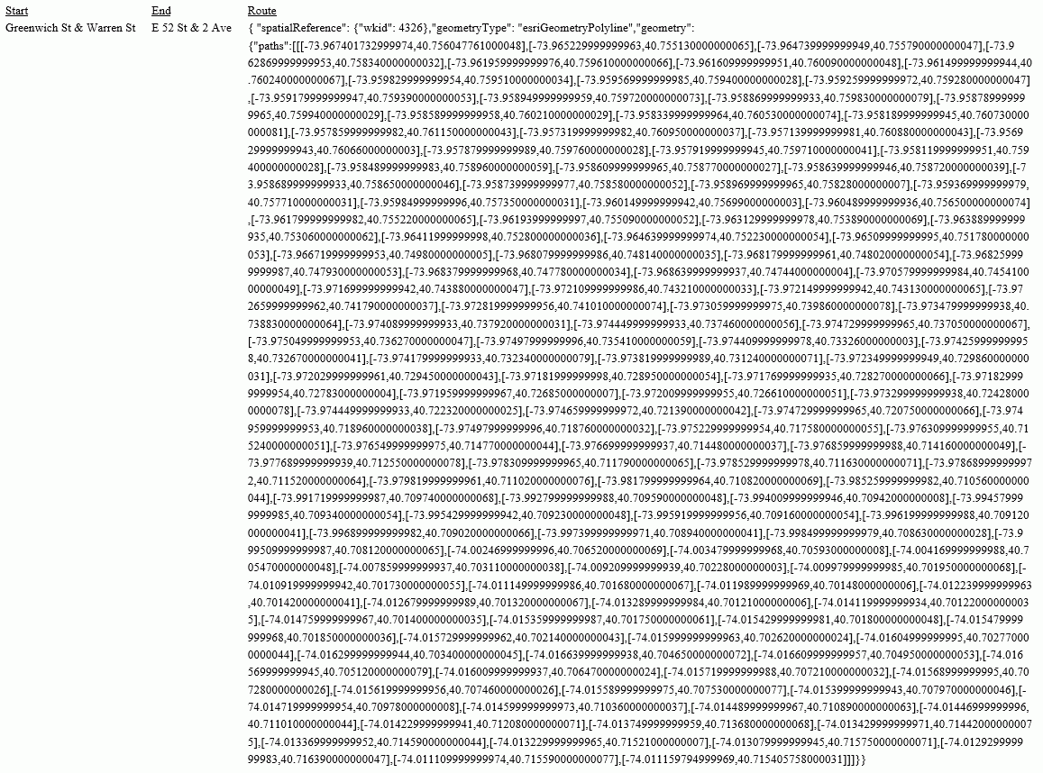 PRINT START_STATION_NAME AS Start END_STATION_NAME AS End Route