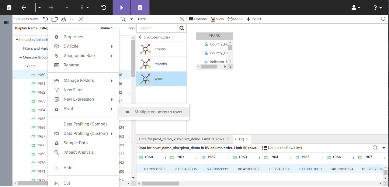 Note: To revert your pivoting changes, right-click the synonym on the Join Editor canvas, and click Remove Pivot.