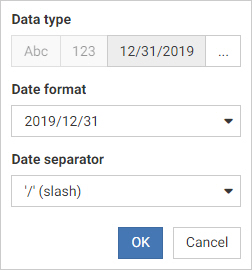 When your data type is a date field, you can make a selection from the supported date formats that are available for selection. The options for a date field are shown in the following image.