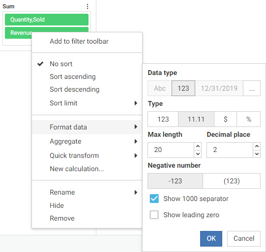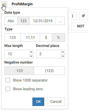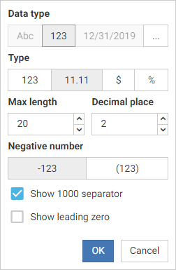 When you select the numeric data type, you can specify number-specific formatting, as shown in the following image.