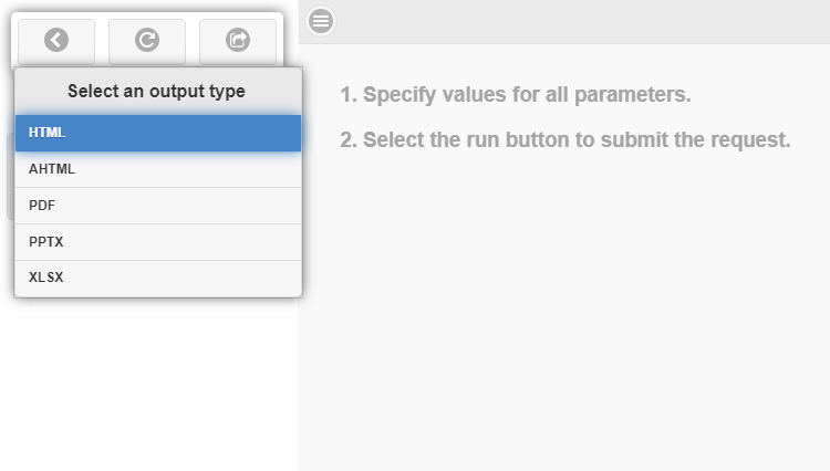 The HTML and AHTML options are browser-based formats, while PDF, PPTX, and XLSX output can be downloaded, distributed, and opened using standard office suite software. The Select at runtime option provides the ability to run a report using any of the other output formats. Users can select a format at runtime in which to run the report.