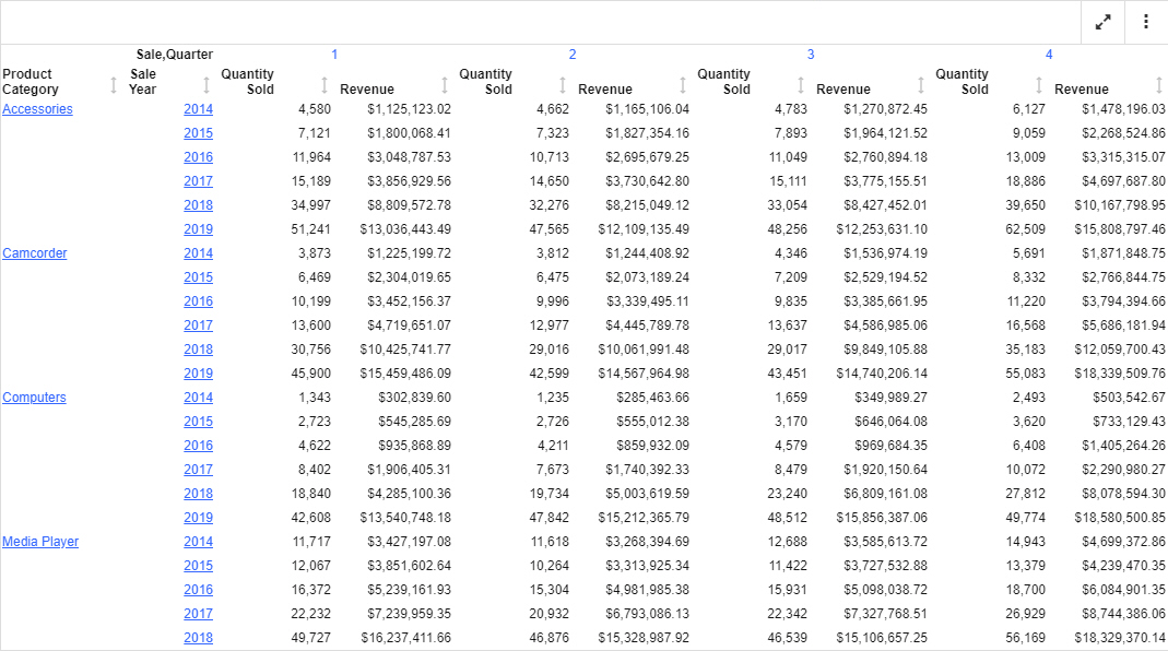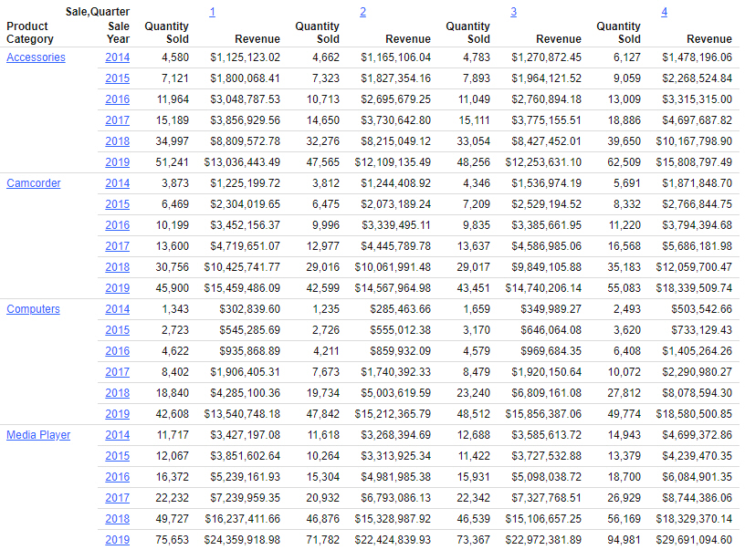The HTML output format generates a basic report that can be run in a web browser. The simplicity of the HTML format makes it extremely flexible. Run-time interactivity is available in the form of hyperlinks, which can be used to drill into data hierarchies used in the report, known as Auto Drill, or connect to outside content through shared parameters associated with sort fields in the report, known as Auto Linking. An example of an HTML report with Auto Drill hyperlink behavior is shown in the following image.