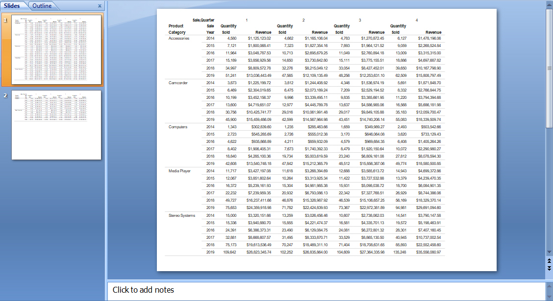 The following image shows an example of a report created using the PPTX output format viewed in Microsoft PowerPoint 2007.
