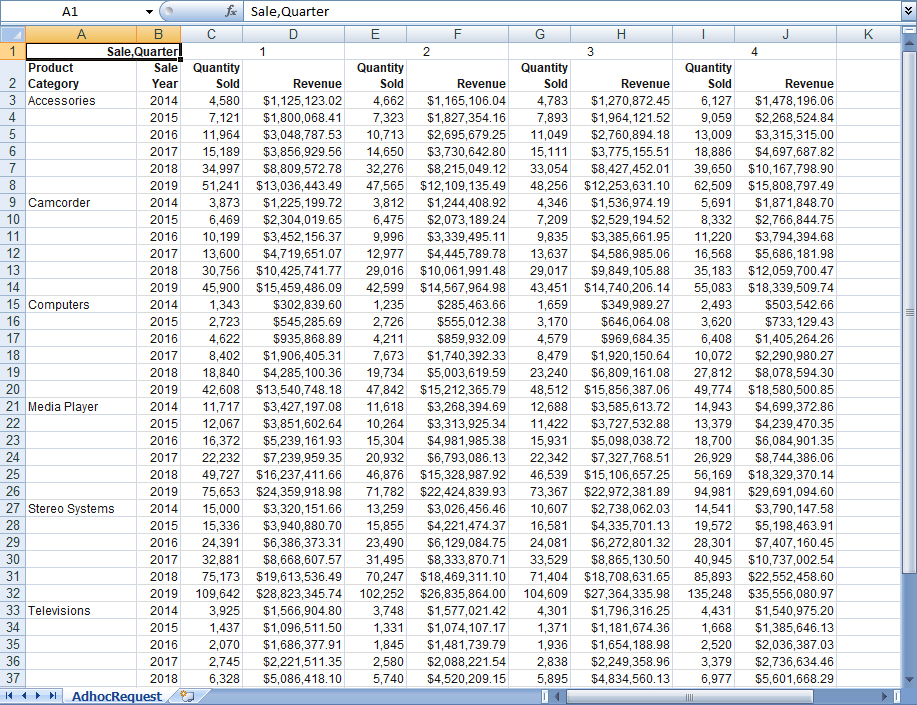 The following image shows an example of a report created using the XLSX output format viewed in Excel 2007.