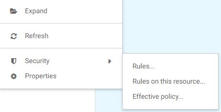 From the shortcut menu, select Security to display Security options: Rules, Rules on this resource, Effective policy.
