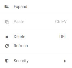 All Web Content subfolders provide the following shortcut menu options: Expand/Collapse, Paste, Delete, Refresh, and Security. These menu options are shown in the following image.