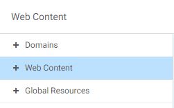 Administrators have access to a Web Content folder on the Domains level in the Resources tree. The Web Content folder provides access to the HTML, CSS, and image files that are associated with legacy self-service applications, such as those that may have been created in earlier versions of App Studio. Clicking on the Web Content folder changes the breadcrumb trail in the navigation bar, as shown in the following image.