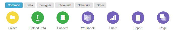 The Action Bar is available on the Home Page, in the Content View and enables you to create analytical content, upload files and spreadsheets, connect to data, build portals and pages, schedule procedures, and generate sample content.