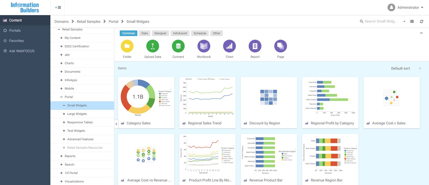 Using WebFOCUS Designer, you can combine related data from multiple sources in a data flow. You can then use a simple, but powerful, set of tools to create a variety of chart types, or use a Technical Preview feature to create tabular reports to communicate detailed information about your data. This content, as well as any other content available in your WebFOCUS repository, can then be added to a page simply by dragging and dropping. With the interactive canvas, you can resize and rearrange resources on the page with ease. Additionally, you can use the integrated filter controls to create instant and compelling applications from your content. You can enhance this content further by bringing your pages together with additional charts and reports in the form of a workbook, allowing you to explore your data in depth and keep your analytical content in one place for quick access. With WebFOCUS Designer, you can go from data discovery to content creation to content integration, and application development all in a single tool.