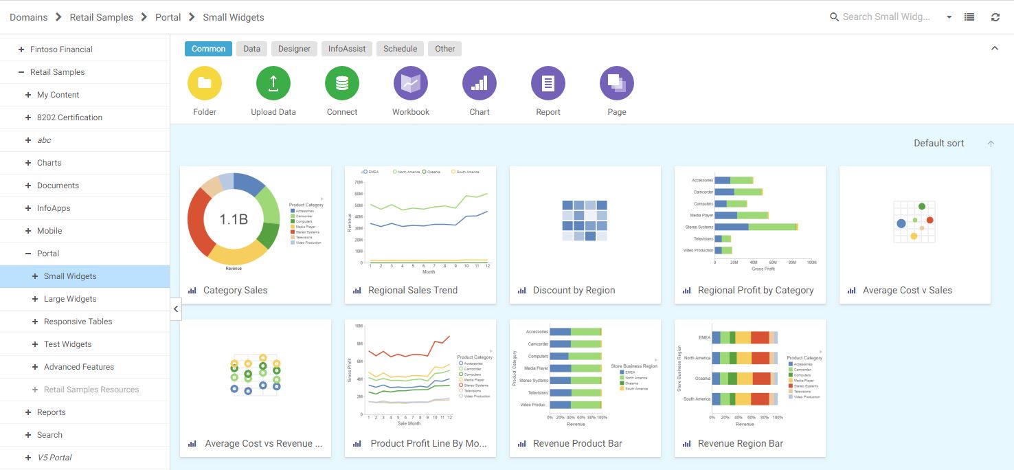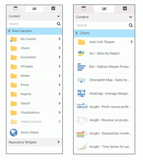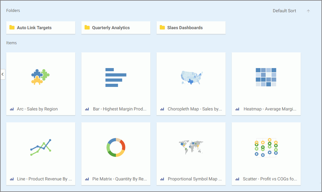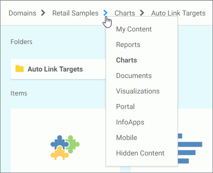 If a resource contains folders and items, the folders are always displayed first, followed by the items. Items shown in the content area include reports, charts, pages, portals, and more.