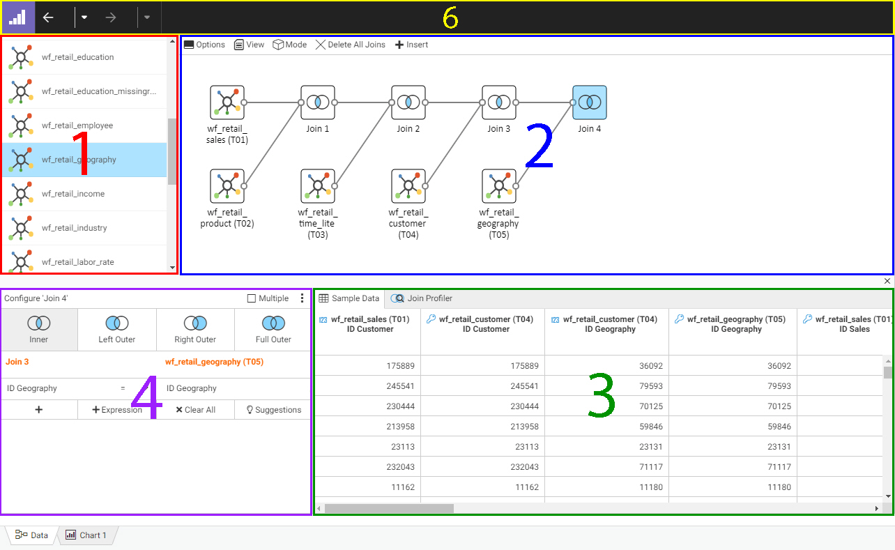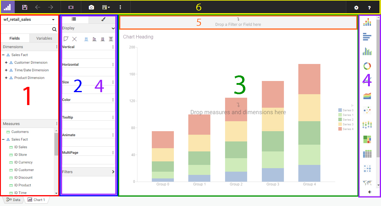 The following images show the locations of the six areas listed above when creating a data flow, chart, report, and page, respectively.
