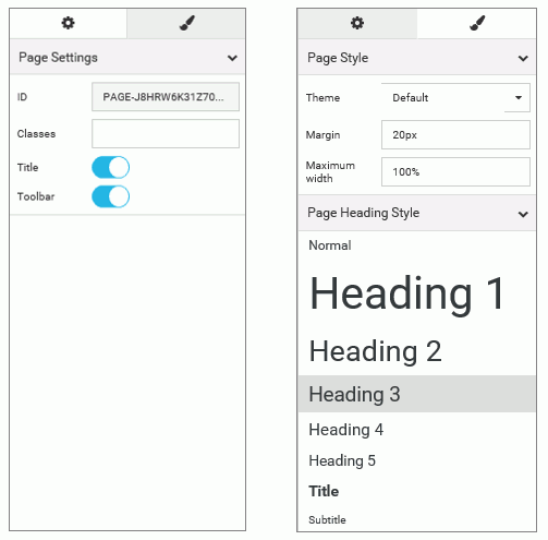 You can use the Properties panel to configure properties for the element that you selected on the page. An example of the Properties panel for a page is shown in the following image. Under the Settings tab, you can toggle the title and toolbar visibility. Under the Style tab, you can configure page style and page heading.