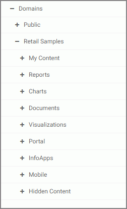 The Resources tree provides a way to view your repository structure and navigate between domains and folders that are available to you. The following image shows an example of a Resources tree.